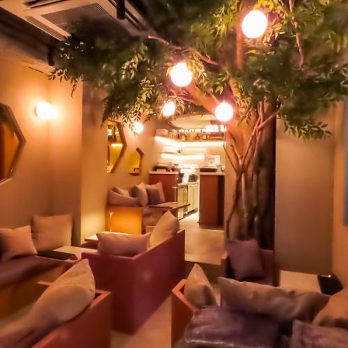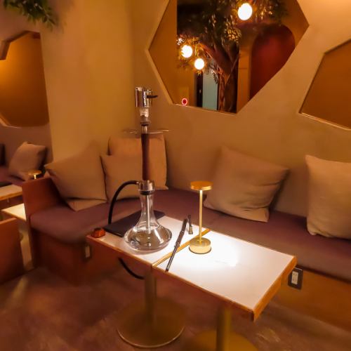 ソファ席は包み込まれるような安心感のある設え。少人数に最適な配置で、ゆっくり会話を楽しむデートや仕事終わりのご利用にもおすすめ。シーシャを傍らに、時間を忘れてくつろげる、隠れ家のような落ち着いた雰囲気が魅力です。